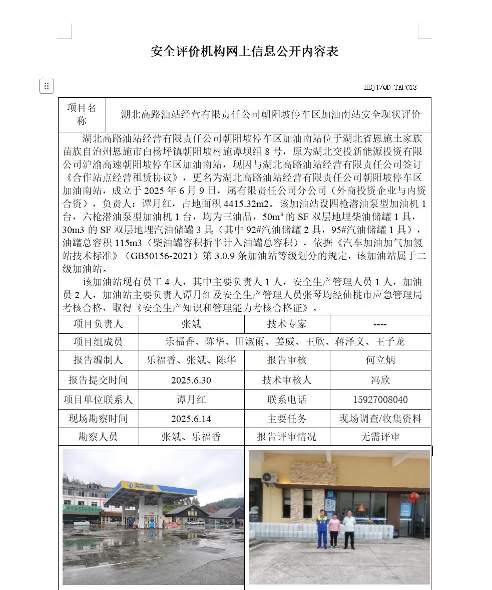 上一篇:?湖北高路油站經(jīng)營有限責(zé)任公司朝陽坡停車區(qū)加油北站安全評價機構(gòu)網(wǎng)上信息公開內(nèi)容表